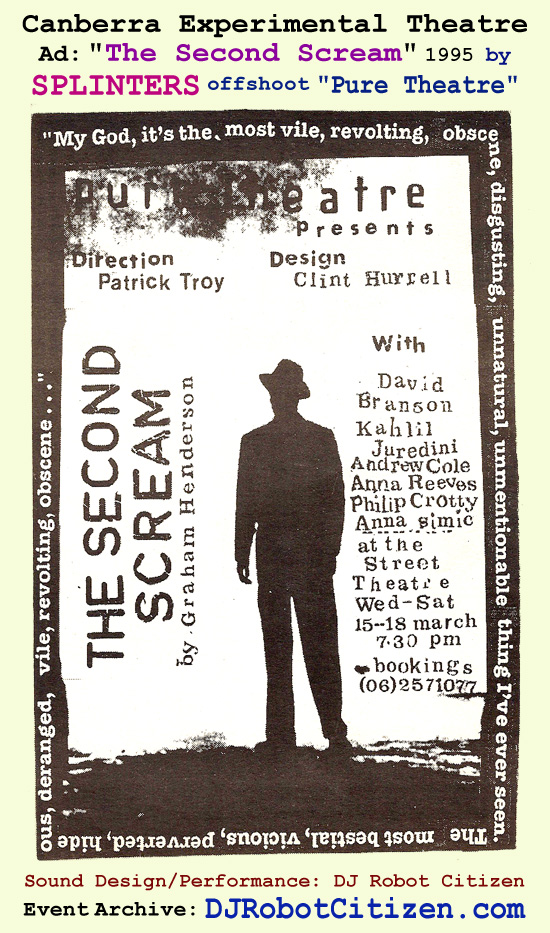 1995 March: I composed part of the score and performed (with a mix of synthesizers and pre-recorded soundscapes) the soundtrack for the Pure Theatre production of "The Second Scream" at the Street Theatre; directed by Patrick Troy; starring David Branson among others. Pure Theatre was a side-project of the larger Splinters Theatre of Spectacle (link to an archive). Splinters put on numerous large and spectacular experimental interactive theatre events from the mid-1980s through to the late '90s.