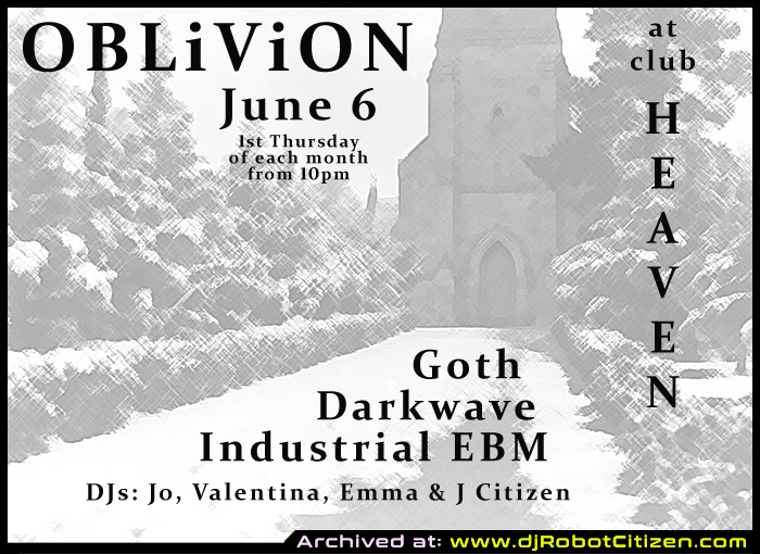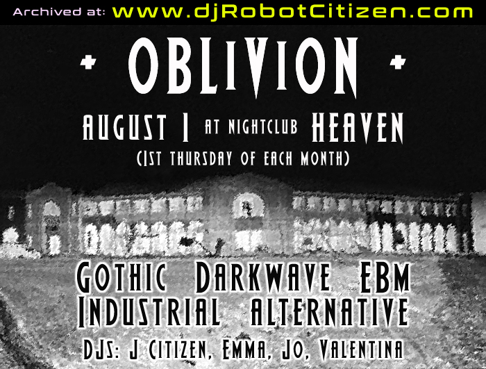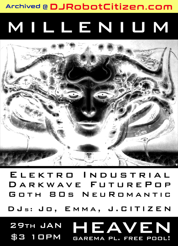 - During 1995-97: "Oblivion" which morphed in to being known as "Millenium". These each lasted about a year, once a month, around 12 clubs each. They covered darkwave, goth, gothic, electro industrial, elektro goth, synth pop, cyberpunk, electronic body music (EBM), euro pop, future pop and similar genres. DJs included: Robot (J Citizen), Jo Cramer, Valentina Maxwell and Emma Lea. (The club changed names when Valentina & Emma emigrated; eventually it became known as 'NEXUS'.)