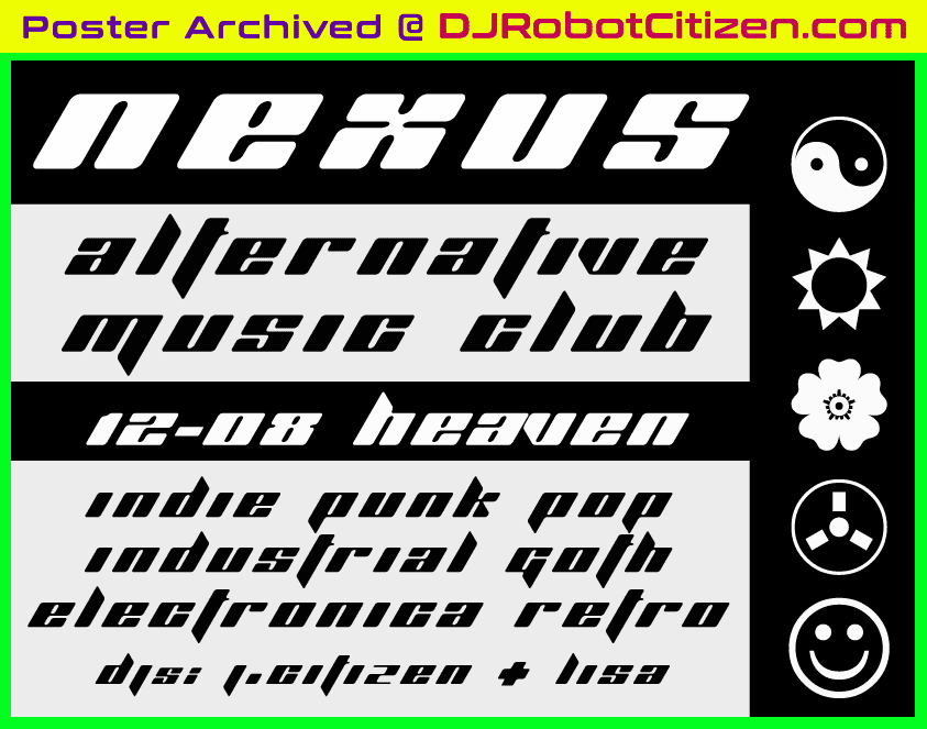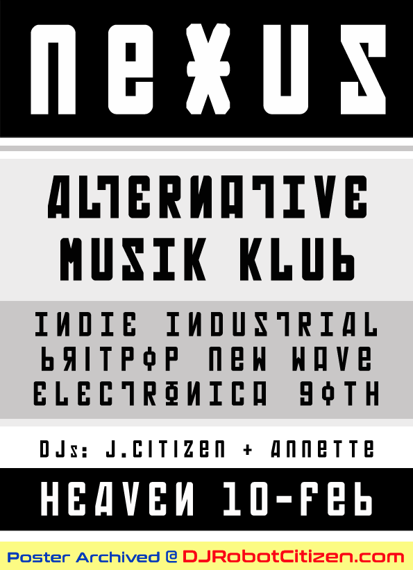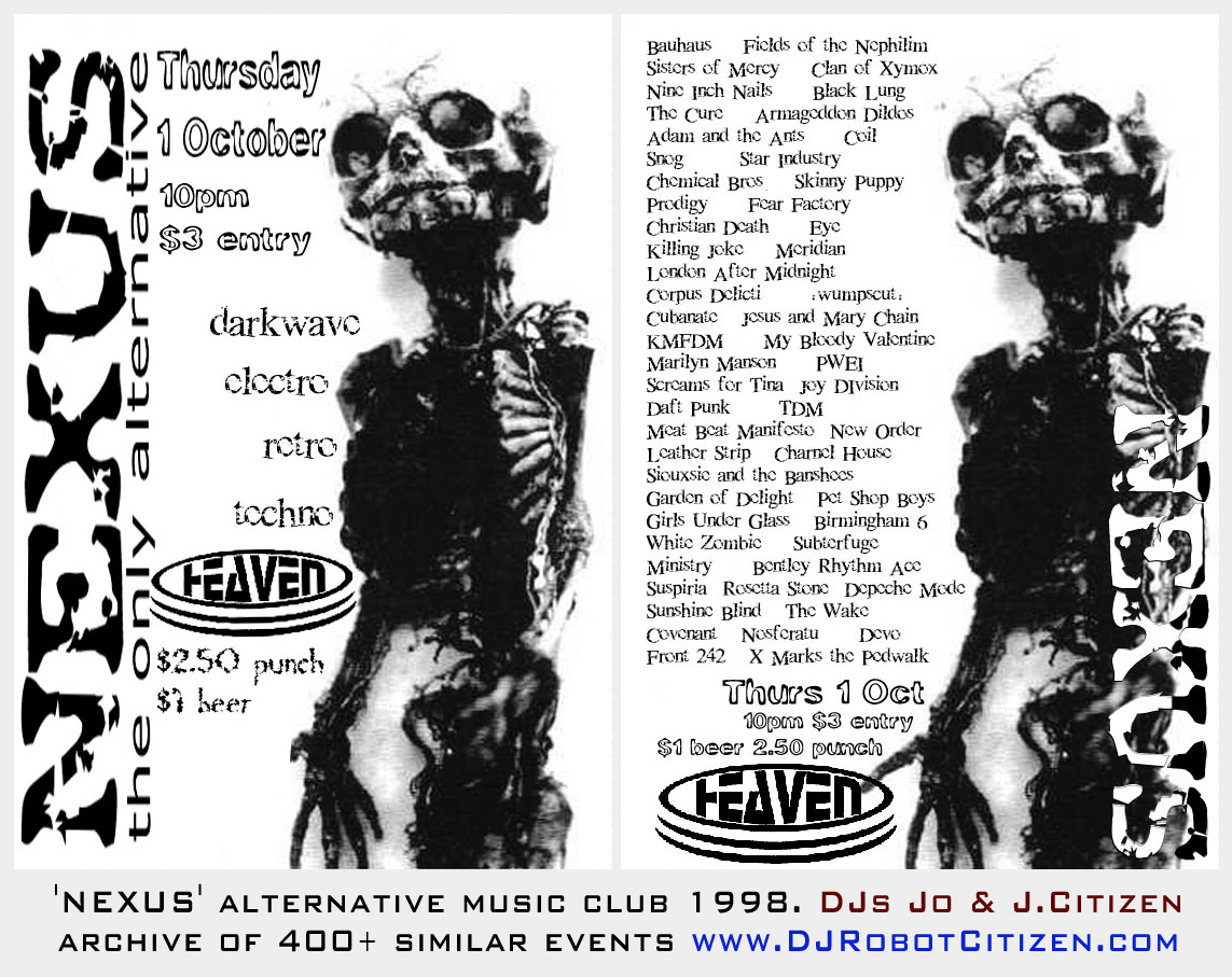- "NEXUS" 1997-2000 - once a month, around 30 events - covering general alternative music genres like indie rock, electronica, britpop, goth, industrial, punk, new wave, darkwave, ska, grunge, post punk, electronic body music and so on. DJs included: (Robot) J. Citizen & Jo Cramer (who moved city in '98); then J Citizen and Lisa Kewley (who moved city in '99); then J Citizen with Annette 'Nettie' Grey. On peak nights NEXUS attracted 100-200 people. NEXUS arose to fill the space left by the cessation of our earlier club names - described below - as colleagues retired from DJing or emigrated to other cities or nations. NEXUS evolved out of the goth-industrial-focused clubs Millenium and Oblivion though I sought it to be more like the general alternative music clubs (of '94-'97) that are listed further below.