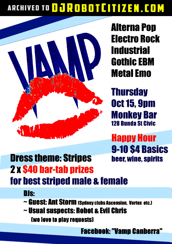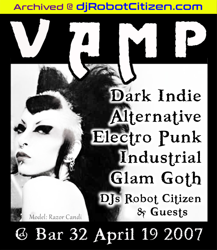 ~ "VAMP" for dark alternative music genres like industrial, alt rock, goth, indietronica, emo, post-punk, new wave, nu metal, electro pop, electronic rock, dance punk and related genres. There were around 30 VAMP events in that 3-year "season". It commenced in April 2007 at the BAR 32 venue. It was initially once-a-month on Thursdays, during early-mid 2007. Due to popularity it went to being twice-per-month towards the end of 2007 and continued like that until mid-2008 with, each month, an event on a Saturday night alternated fortnightly with a Thursday. The peak event was Easter Thursday 2008 which attracted a crowd of around 350 people. VAMP left Bar 32 in mid-2008 and ran through 'til the end of 2009 at 3 other venues: Holy Grail in mid-2008; Kremlin Bar from November 2008 to August 2009; The Monkey Bar for October-November 2009.