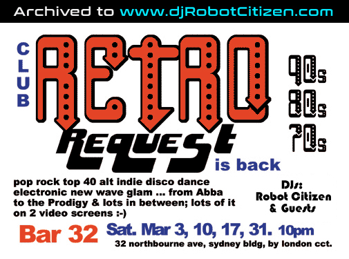 ~ "RETRO Request" was the first event I ran at Bar 32. The music scope was for Top 40 hits and party anthems from the '70s, '80s, '90s and early '00s - pop, rock, disco/dance hits. The event occurred on every Saturday for 7 months from February 2007; around 30 events overall.