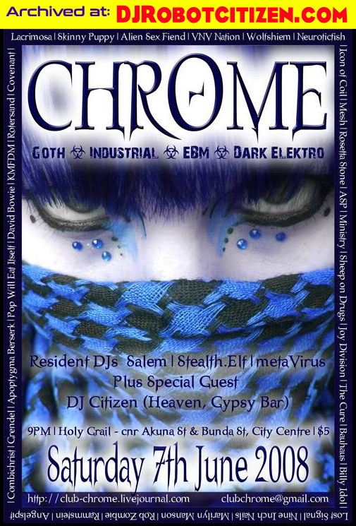 - 2004-July-30 Saturday: I co-organised another radio 2XX fundraiser club night at the Toast venue. It was named "S.I.N.G.E.D." being the name of my dark alternative music radio show - standing for "Synthpop Industrial Noise Gothic Electro Darkwave". The night featured those genres. The core DJs were my co-hosts on the radioshow. The profits were donated to Community Radio 2XX 98.3fm. This was the first club night for these genres in Canberra for several years; also being the first at Toast. The success of it led to the venue's wish to have a similar monthly night. However, I was too busy with other projects and recovering from an injury. Hence other people took up that opportunity with an event titled "Eclipse" which changed name to "Chrome" after several months. That event occurred once a month on a Thursday night during 2005-2006. For several years it was quite a small gathering of 30-60 people although it was my favourite time there because the people were genuinely in to the subcultures/genres; was a good crowd. I preferred Thursday events because it meant only the most interested people - those really in to the music and scene - would attend. Then in 2007 - with VAMP & RETRO occurring also - the multiple clubs at separate venues, 6+ dates per month, including numerous weekend dates, that built a very big scene. Eventually all clubs were often attracting 150 to 300+ people on weekend nights. It was both wonderful and bizarre to me - with the goth-industrial club scene having been dead, for lengthy periods, numerous times before - to revive in such a grand manner. Although, to be honest, many of those people weren't really in to the music; it was more like they were spectating, having heard it seems that there were clubs with weird freaky people to look at. ;) Chrome lost their venue in November 2007 (when Toast closed) and re-opened at another in April 2008. During the 4-5 month gap I allocated numerous extra guest DJ slots to those Chrome DJs at my events titled VAMP & CRUNCH; also at the mid-2008 SNOG & Sobriquet band concert that I hosted at the City Holy Grail venue (see notes above). Chrome continued on very successfully (at several venues over the years) until retiring in December 2016.