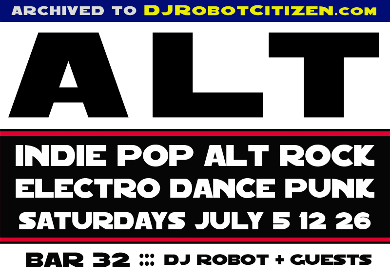 ~ "ALT" for general alternative indie & electro pop, punk & rock; around 6 Saturday events during May, June, July and August 2008. The ALT nights at Bar 32 were very successful. In particular I really enjoyed DJing the entire 6 hour nights. However, because of the events great success it was undermined by someone else who sought to claim all the profits off of my hard work. They made things unpleasant, split the scene and so I moved my efforts to other projects.