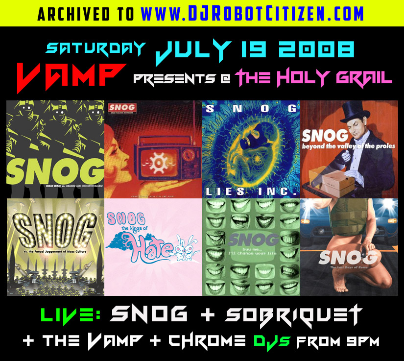 2008-07-21: One of the highlights of VAMP during this time was the concert I organised for the renowned Melbourne-based band SNOG (electro-industrial dark electronica) along with support group Sobriquet (darkwave-electronica). I hosted this concert at the Civic Holy Grail venue (where I had run numerous RETRO events during 2003-2004). I also included the DJs from the Chrome club night (who were then Salem, MetaVirus, Stealth Elf) and regular VAMP guest DJ Evil Chris. The night was a great success attendance-wise.
