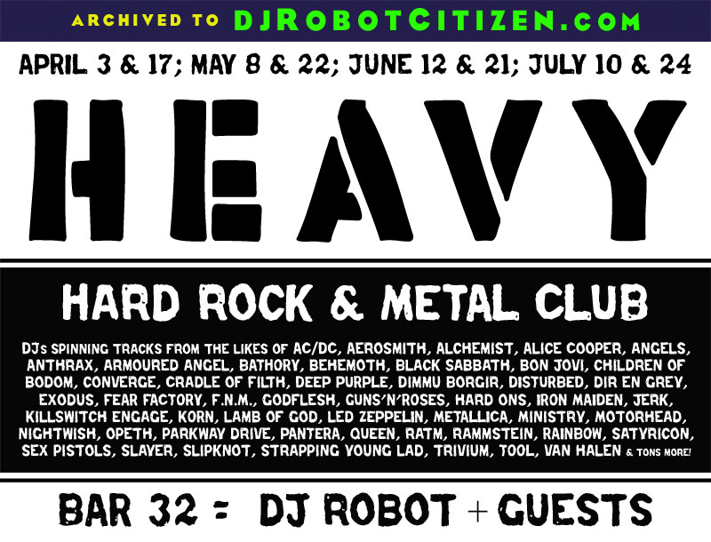 ~ "HEAVY" for hard (punk) rock and metal; 8 or so events during mid-2008; mostly on Thursdays with one on a Saturday night. As well as DJ Robot Citizen regular guest DJs included F.O.A.D. (Michael) and Evil Chris.