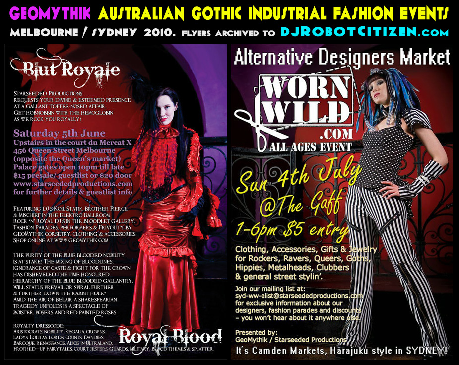 2010-June-05 Melbourne: "Blut Royale" a fashion show for the Geomythik fashion label. I helped with transporting, setting up and packing down the large stage props and decorations and also DJ'd for part of the night including during the fashion show. Venue: Mercat X Hotel, Queen St Melbourne, adjacent to the Victoria markets.