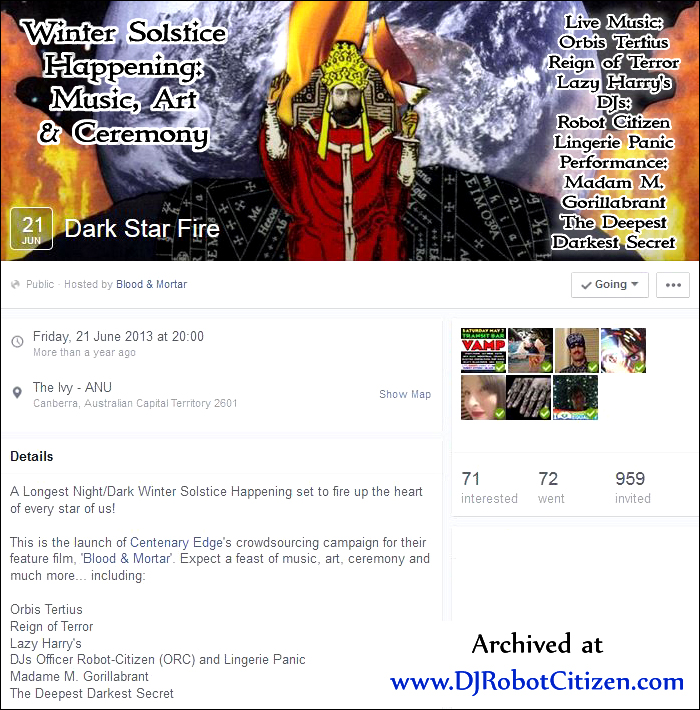 2013 June 21 "Dark Star Fire" also featuring several bands (Orbis Tertius, Reign of Terror, Lazy Harry's) & live performances (by Madame M. Gorillabrant, The Deepest Darkest Secret) at the Ivy Cafe in Old Canberra House.