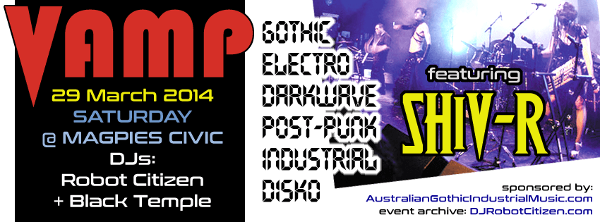 2014 March 29 "VAMP" featuring a live performance by Sydney electro-industrial band Shiv-R plus DJs Robot Citizen and Black Temple @ Magpies City Club, Canberra City.