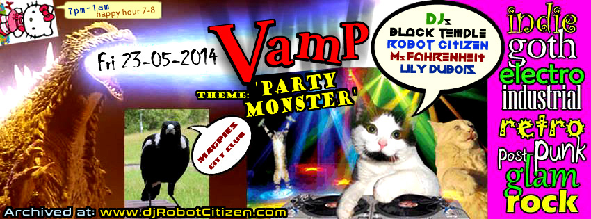 Along with DJ Robot Citizen the guest DJs at VAMP during 2007-2009 included: Evil Chris, The Modern Rage (Emma), Terrorgore (Bridget), DeadKitty / Lingerie Panic (Patricia), Morgan Mortician, F.O.A.D. (Michael), Stealth Elf (Callan), Salem (Chris), MetaVirus (Shayne), Jay, Nick Simons & Ant Storm.