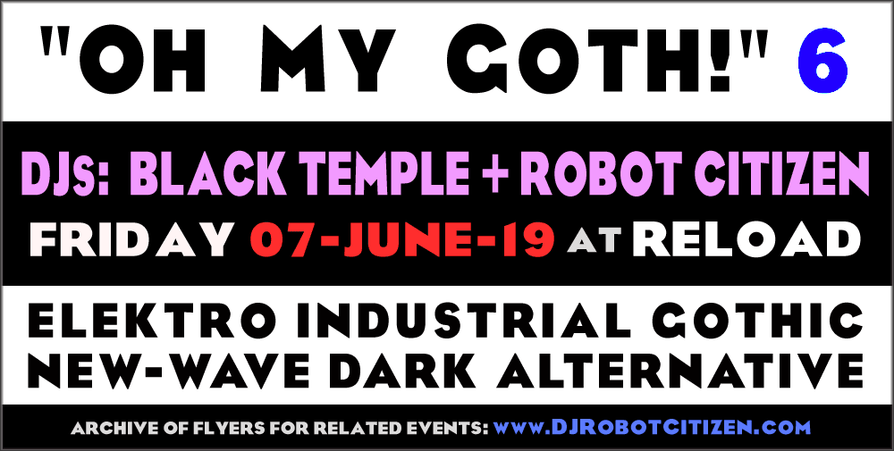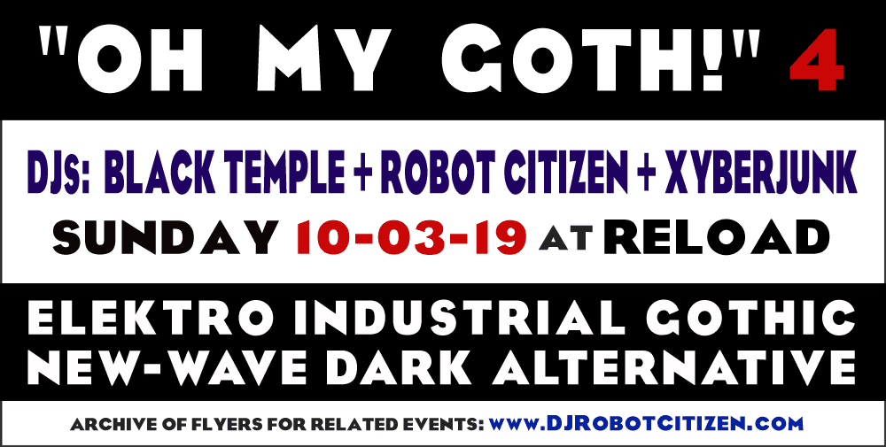 2019 March 10 - "Oh My Goth" #4. Venue: Reload bar, Canberra City. DJs Black Temple, Robot Citizen & Xyberjunk (formerly known as WolfAngst) ...